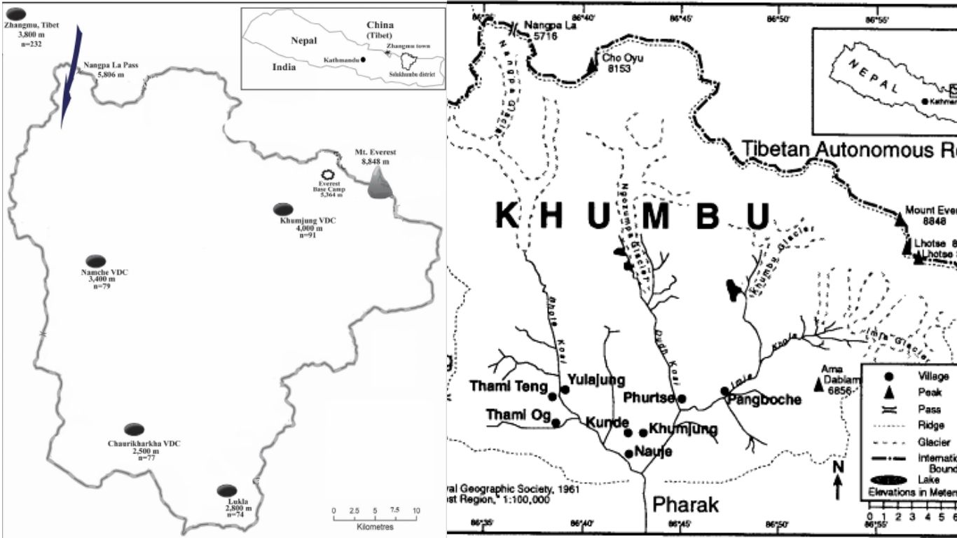 Furthermore, Sherpas can also be found in the Lantang-Helambu region north of Kathmandu, as well as in the valleys of the Dudh Kosi and Rolwaling Rivers to the west of Solu-Khumbu. They are mostly settled in high-altitude valleys ranging from 9,000 to 14,000 feet